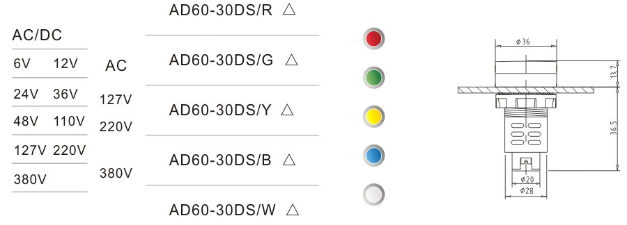 6V 12V 24V 36V 48V 110V 127V 220V 380V |