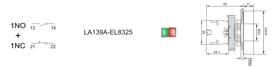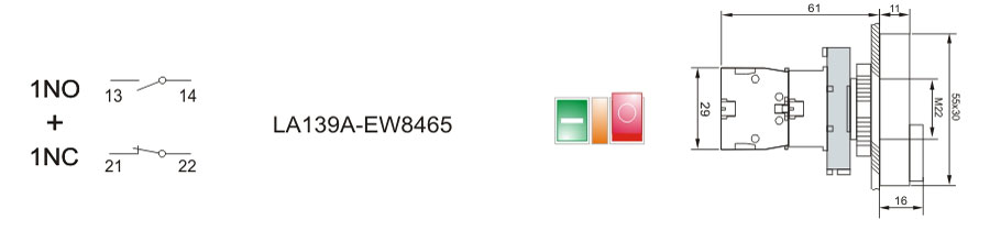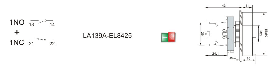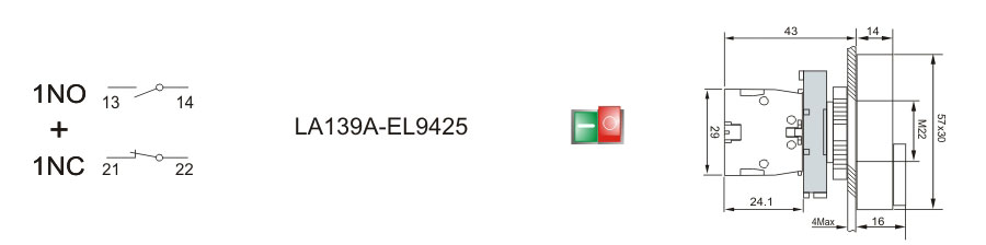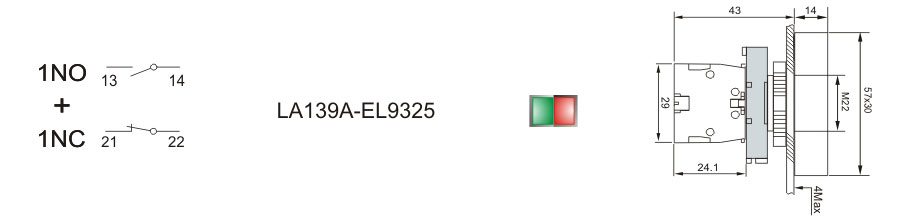 整體型號LA139A 按鈕頭-觸點基座組裝 按鈕頭自動保持在開孔中 按鈕頭旋轉一定角度,卡入觸點基座 2個金屬螺釘固定 防震 自動接地 敞開式接線端,無需預松螺釘 電氣功能 最多可裝6付觸點模塊 |