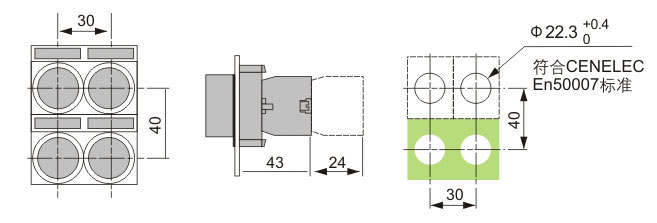 1個紅色指示燈,直接供電≤130V★ 2個彈簧復位按鈕 1沖紅色 1顆綠色 IP40/54 |