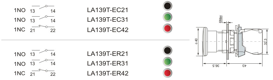 A :平鈕按鈕 L :凸鈕按鈕 P :帶罩按鈕 W :帶燈按鈕 D :選擇開關短柄 J :選擇開關長柄 G :鑰匙開關 E :觸點模塊 Z :觸點模塊加中座 B :蘑菇頭按鈕(?30) C:蘑菇頭按鈕(?40) R :蘑菇頭按鈕(?60) S4 :急停按鈕(旋轉釋放,?30) S5 :急停按鈕(旋轉釋放,?40) S6 :急停按鈕(旋轉釋放,?60) T :急停按鈕(拉拔釋放) V:指示燈 |