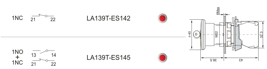 ES5 急停鈕(旋轉釋放,?40) ES1 急停鈕(鑰匙旋轉釋放,?40) ET 急停鈕(拉拔釋放,?40) |