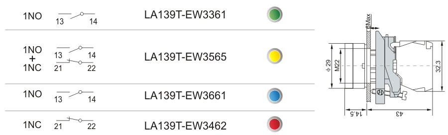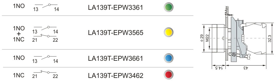 帶燈型 EW3 燈鈕(平頭型) EPW3 燈鈕(平頭型,帶防水罩) |