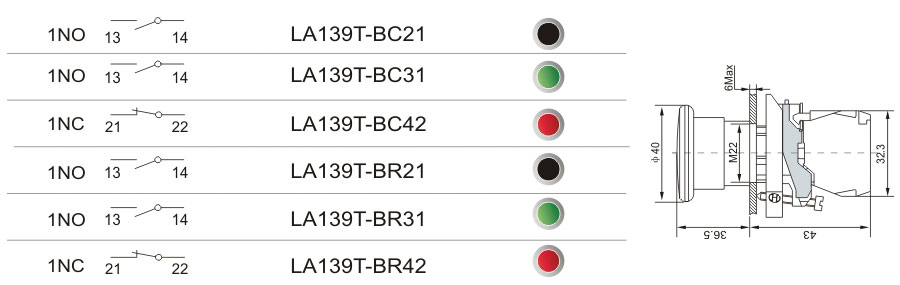 A :平鈕按鈕 L :凸鈕按鈕 P :帶罩按鈕 W :帶燈按鈕 D :選擇開關短柄 J :選擇開關長柄 G :鑰匙開關 E :觸點模塊 Z :觸點模塊加中座 B :蘑菇頭按鈕(?30) C:蘑菇頭按鈕(?40) R :蘑菇頭按鈕(?60) S4 :急停按鈕(旋轉釋放,?30) S5 :急停按鈕(旋轉釋放,?40) S6 :急停按鈕(旋轉釋放,?60) T :急停按鈕(拉拔釋放) V:指示燈 |