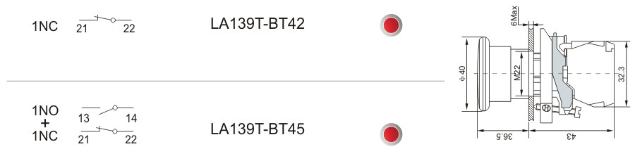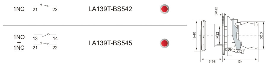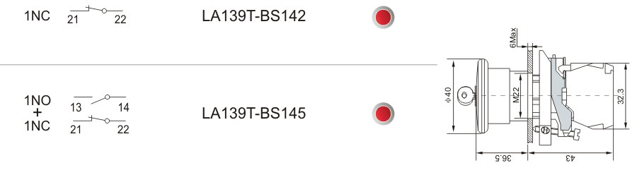 BS5 急停鈕(旋轉釋放,?40) BS1 急停鈕(鑰匙旋轉釋放,?40) BT 急停鈕(拉拔釋放,?40) |